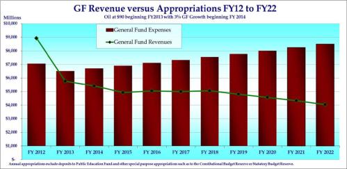 Under that scenario, continued oil production declines push the state into the red beginning next year and keep it in that position thereafter.