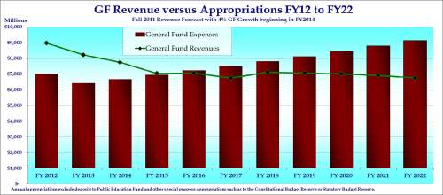 That scenario is about as close to a “best case” as you can get. The chart nevertheless shows that continued production declines send the state into the red by 2016 and keep it there from then on. (Spending levels are shown by bars; revenue levels are shown by a line.)