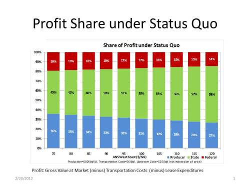 Addendum (Feb. 28, 2012): A sharp-eyed reader has pointed out that the original version of the above commentary appeared on occasion to confuse two numbers on the chart referenced above entitled “Profit Share Under Status Quo.” In determining the level of federal tax for purposes of calculating the combined federal and state tax rates at a couple of points, the reader pointed out that the commentary appeared to use the percentage in the chart designated as the “Producer” share instead of the percentage designated as the “Federal” share. The reader is correct and I have revised the commentary today to correct the error. In correcting for the error, I have used instead the marginal federal tax rate of 35%, rather than the slightly lower rates for federal taxes I originally used. As I have explained in another piece, the marginal federal rate is the correct rate to use in the analysis because the current debate is focused on whether the current tax structure discourages new investments, and the marginal rate is the rate used by most investors to determine whether to make new investments. That is because the incremental income produced from new investments is taxed at or close to the marginal rate unless the investments create additional federal tax credits sufficient to reduce the long term marginal rate. Because expansions of existing producing areas especially seldom generate additional credits that materially affect the long term tax rates applicable to incremental production, the normal rule is to assume that the income produced from the incremental investments will be taxed at the marginal rate. The tax rate shown on the chart for “Federal” taxes appears to be the weighted average tax rate resulting from including in the calculation the tax effect of past investments, and thus, is not forward looking in the same way that investors consider in making new investments. The same adjustment is not made for the state tax rates used in the chart. That is because, under ACES, the marginal production tax rate applicable at any given oil price automatically applies to all production; thus, for the most part, the state tax rates at any given oil price on the chart already reflect the marginal rate. Correcting for the error does not change any conclusions contained in the commentary.