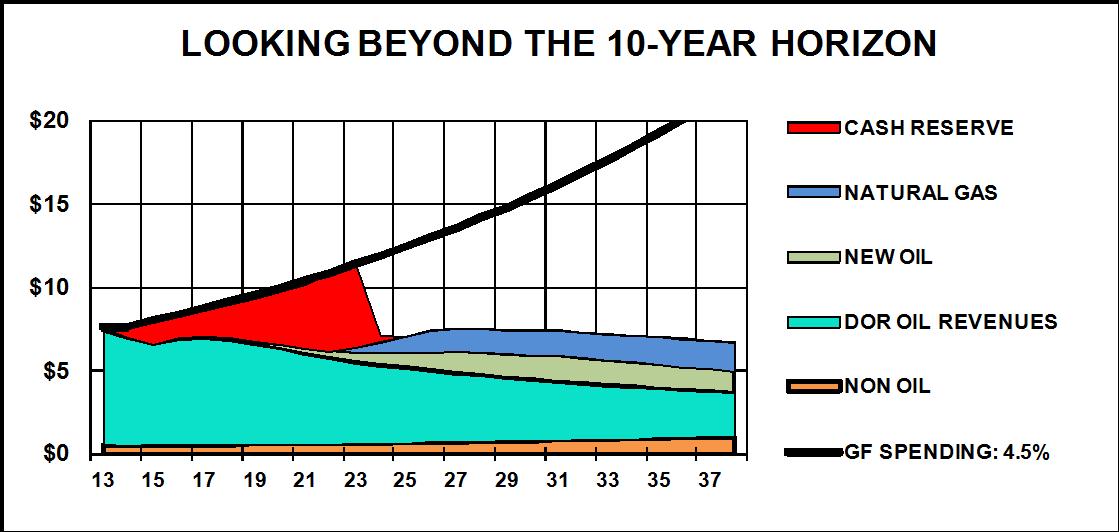 Comparing the chart accompanying that study (left) with the one above for PERS/TRS demonstrates the truly desperate fiscal situation that Alaska faces beginning in the increasingly near future. Just as the PERS/TRS obligation ramps up to in excess of $1 billion/year, at current spending levels the amount available to pay those and the state’s other General Fund obligations will fall below $5 billion per year.