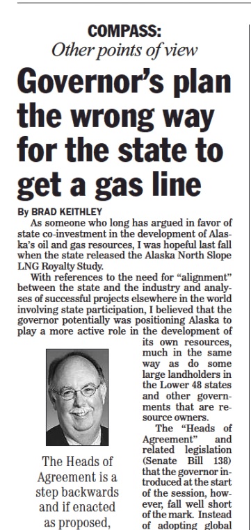 The “Heads of Agreement” and related legislation (Senate Bill 138) that the Governor introduced at the start of the session, however, fall well short of the mark. Instead of adopting global best practices taken from successful LNG projects, the Governor’s proposal is a confusing patchwork that is fraught with risk and even if it works perfectly, would not advance the goal of enabling the state to help drive increased activity where Alaska needs it most – in the upstream development of its oil and gas resources. Continue reading →
